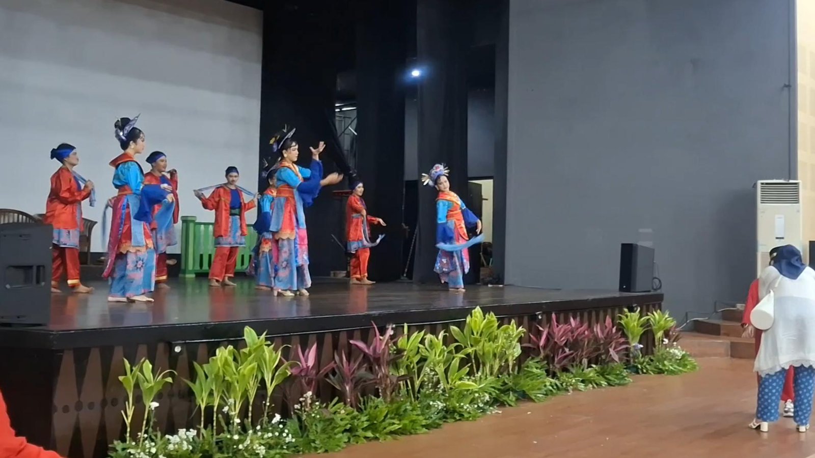 Suasana di balik panggung tampak semarak. Para penari sibuk memastikan riasan wajah dan kostum mereka siap tampil, sementara pengaturan panggung kembali dicek secara cermat. Menariknya, di sela-sela persiapan, para penari juga menyempatkan diri menyapa penonton dengan mengedarkan kudapan, menciptakan keakraban bahkan sebelum pertunjukan dimulai.