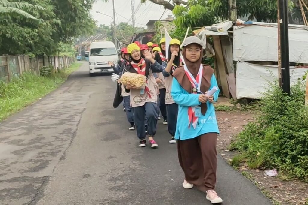 Rombongan anggota Pramuka menelusuri jalan perkampungan di Desa Jabon Mekar, Parung, Bogor. (Rumah Simbah/Siz) Bogor (Rumah Simbah)-Sekitar 120 anggota Pramuka dari berbagai pesantren, dengan Pondok
